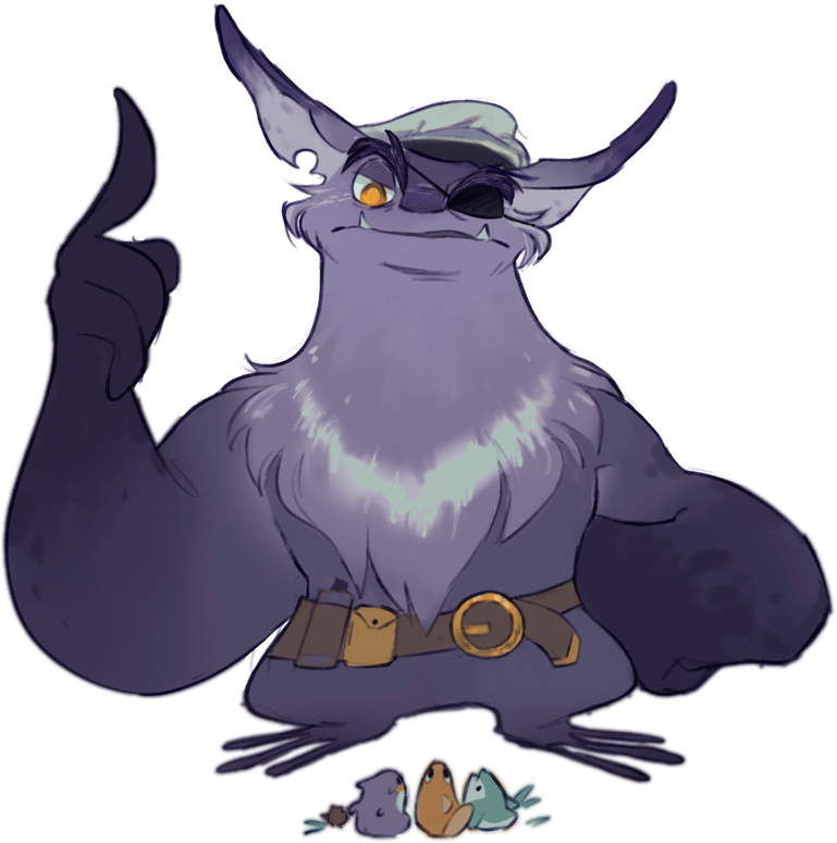 He always wears his utility belt but doesn't always wear his captain's hat. Mort is a rough-around-the-edges Bakiri with a grizzled exterior, but a soft heart within. He’s the gatekeeper of the entrance to the Hallogrove forest for the yearly Passage. Mort is a retired explorer and now operates riverboat services on the Boreli river. He self-describes as having worn many hats-- figuratively and literally!