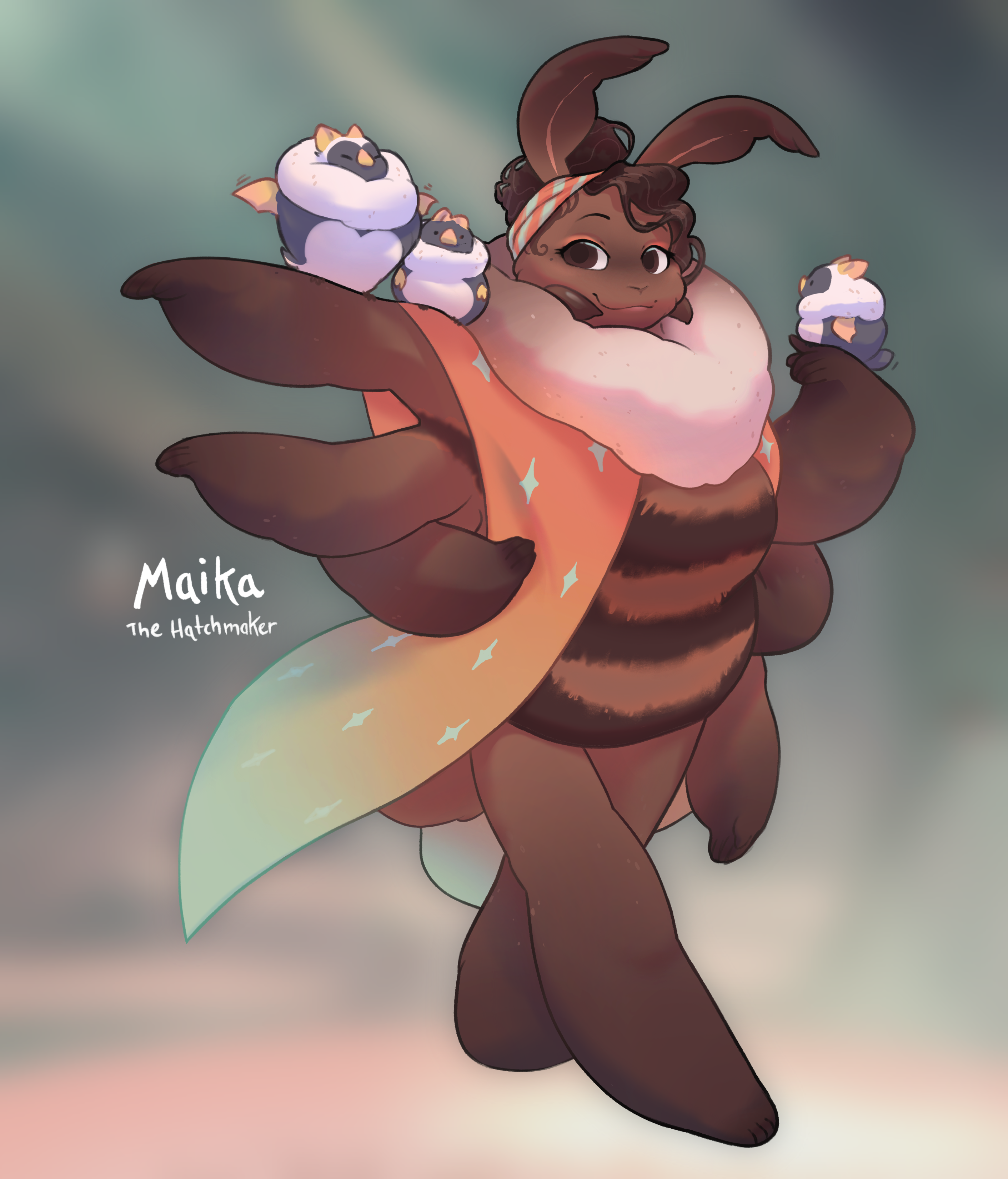 A spunbii that lives in the Wishcaves year round to tend to the sacred caves. She'll leave occasionally to collect supplies, but doesn't travel far from Adriff, she's known with the locals that live among the floating isles. She's known to be warm, welcoming and caring as she helps couples make their wish each year in the caves, she then spends time ending to the pools and then the eggs that are magically made from wishes made in the caves. Her loyal Incubats help her tend to these eggs as well.