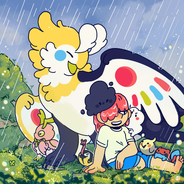 Semiplume, Buttercorn, Mallow, and a handful of Ranebos encounter a suprise rainshower and a curious visitor.